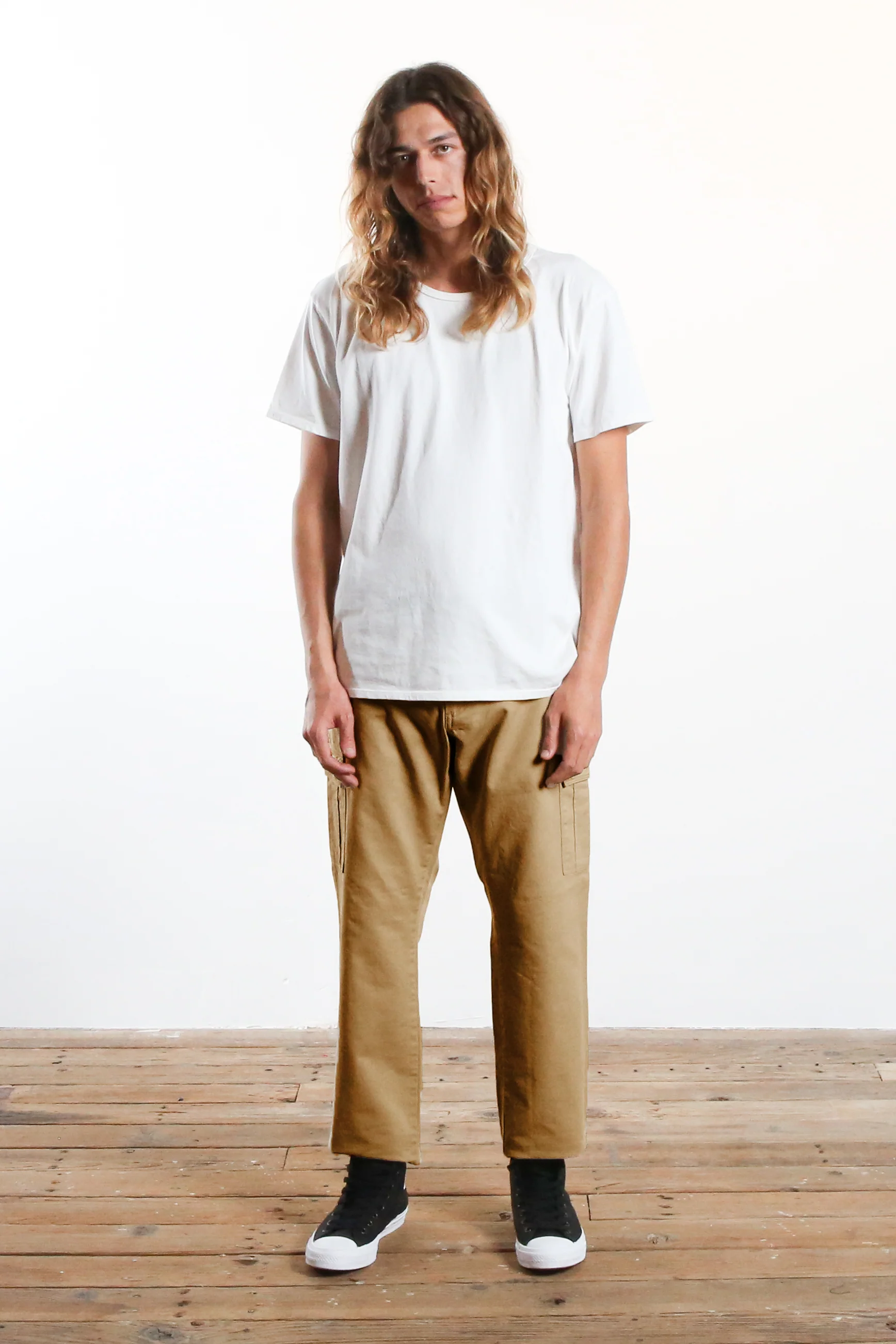 This pant is made from an organic cotton then stone washed to a soft finish.  The lining and pocket bags are made from a durable nylon blend for a very smooth and comfortable wear.  The rear features two double flap, single welt pockets.  The main feature are the two oversized cargo pockets at the lower thigh sewn with a tight 1/8 double needle stitch detail.  Both pockets are secured with two Universal  snaps sewn into the garment.  Custom hardware for both the main button and zipper fly