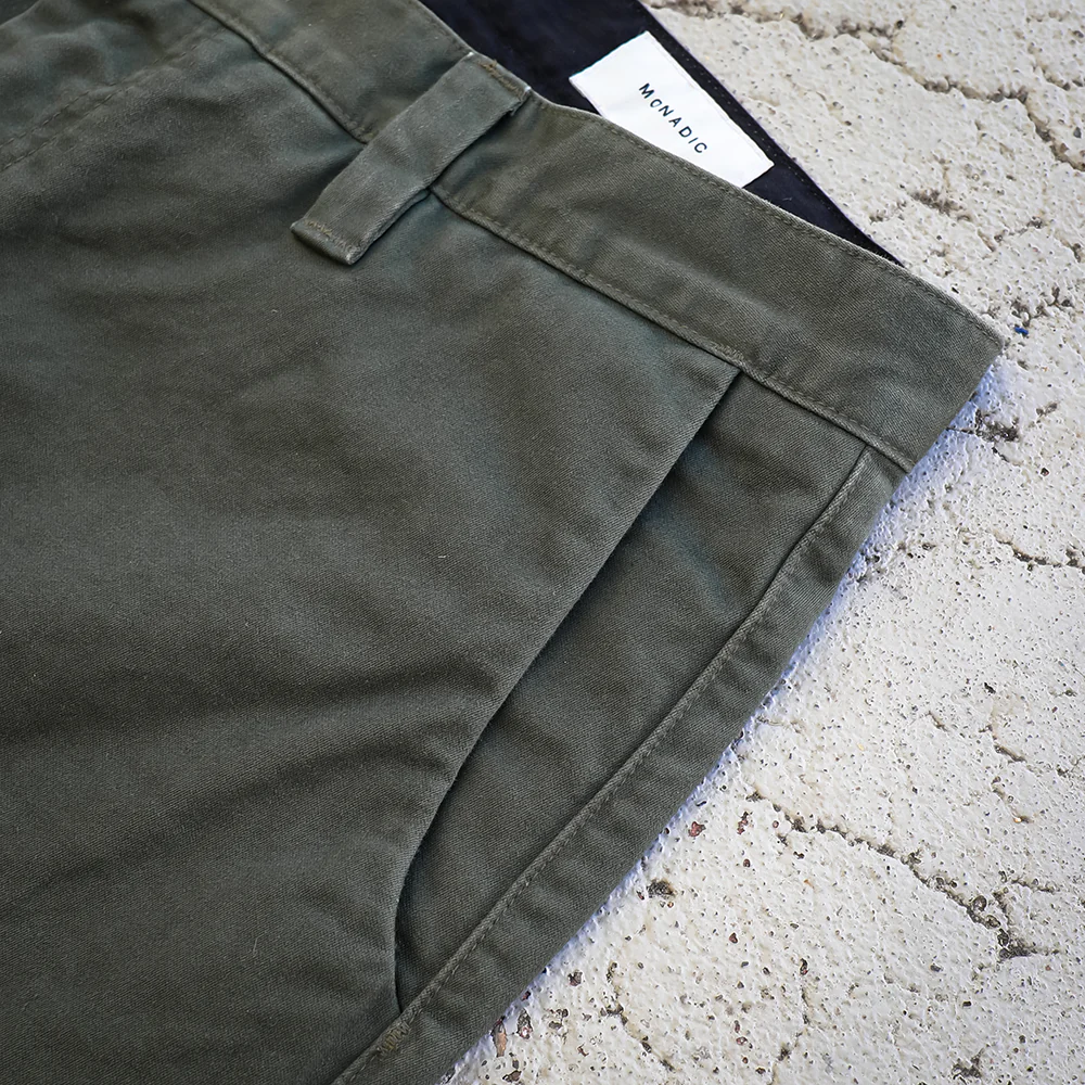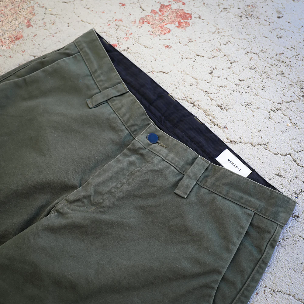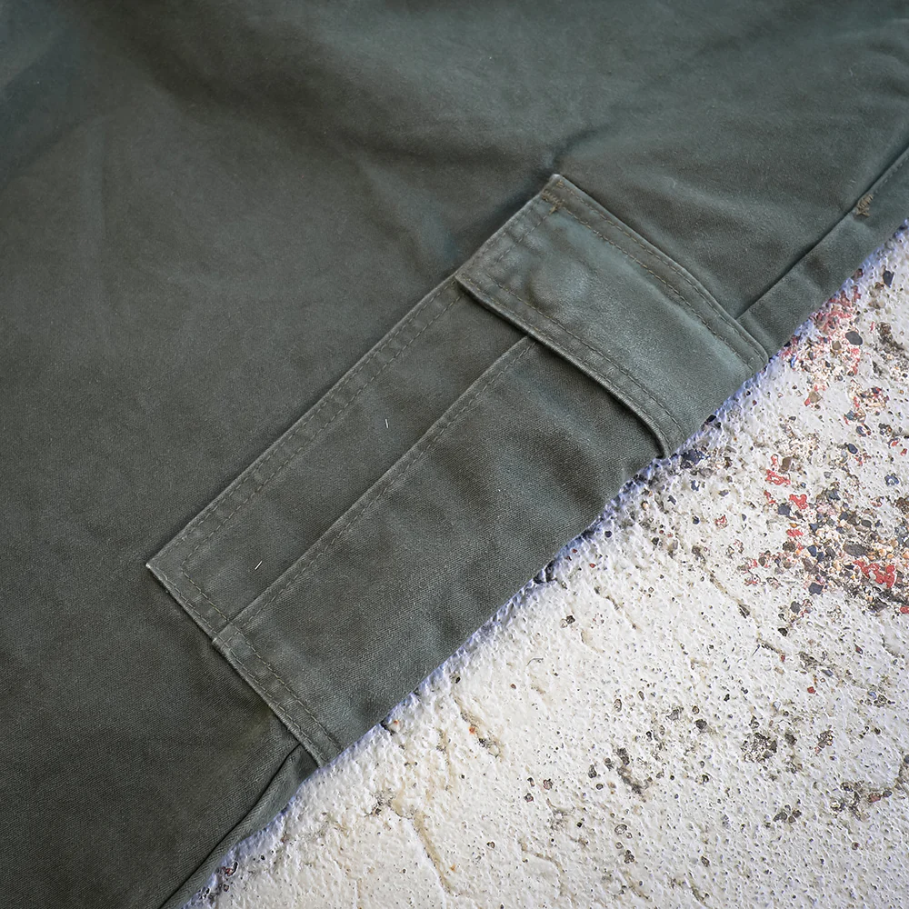 This pant is made from an organic cotton then stone washed to a soft finish. The lining and pocket bags are made from a durable nylon blend for a very smooth and comfortable wear. The rear features two double flap, single welt pockets. The main feature are the two oversized cargo pockets at the lower thigh sewn with a tight 1/8 double needle stitch detail. Both pockets are secured with two Universal snaps sewn into the garment. Custom hardware for both the main button and zipper fly