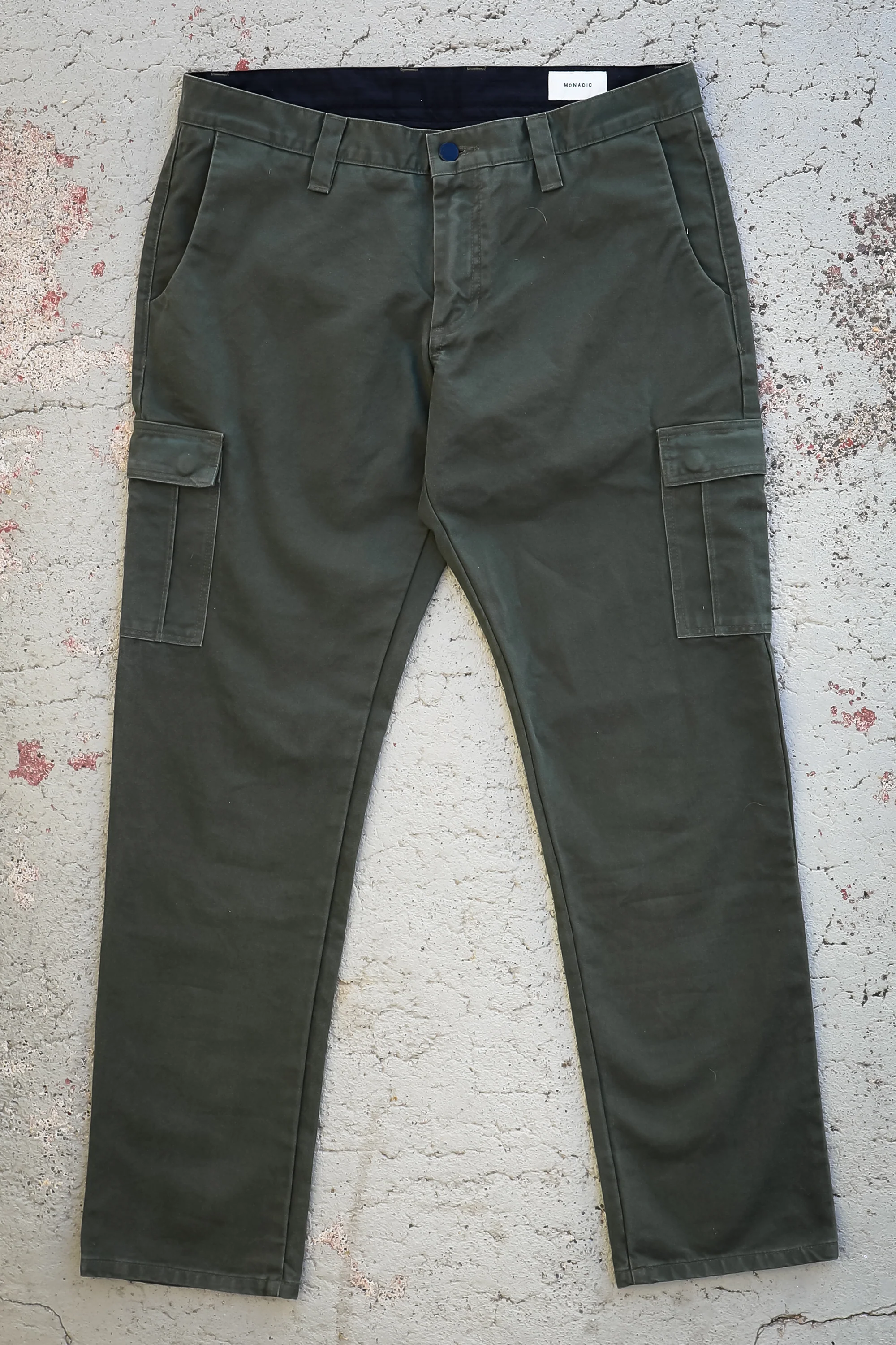 The Relaxed Taper Cargo Chino. The fit is a comfortable top block with a gradual taper from knee to the leg opening. The regular front rise is meant to sit at hip and from there the moderate thigh measurements provide space through the knee and comfort all around.
