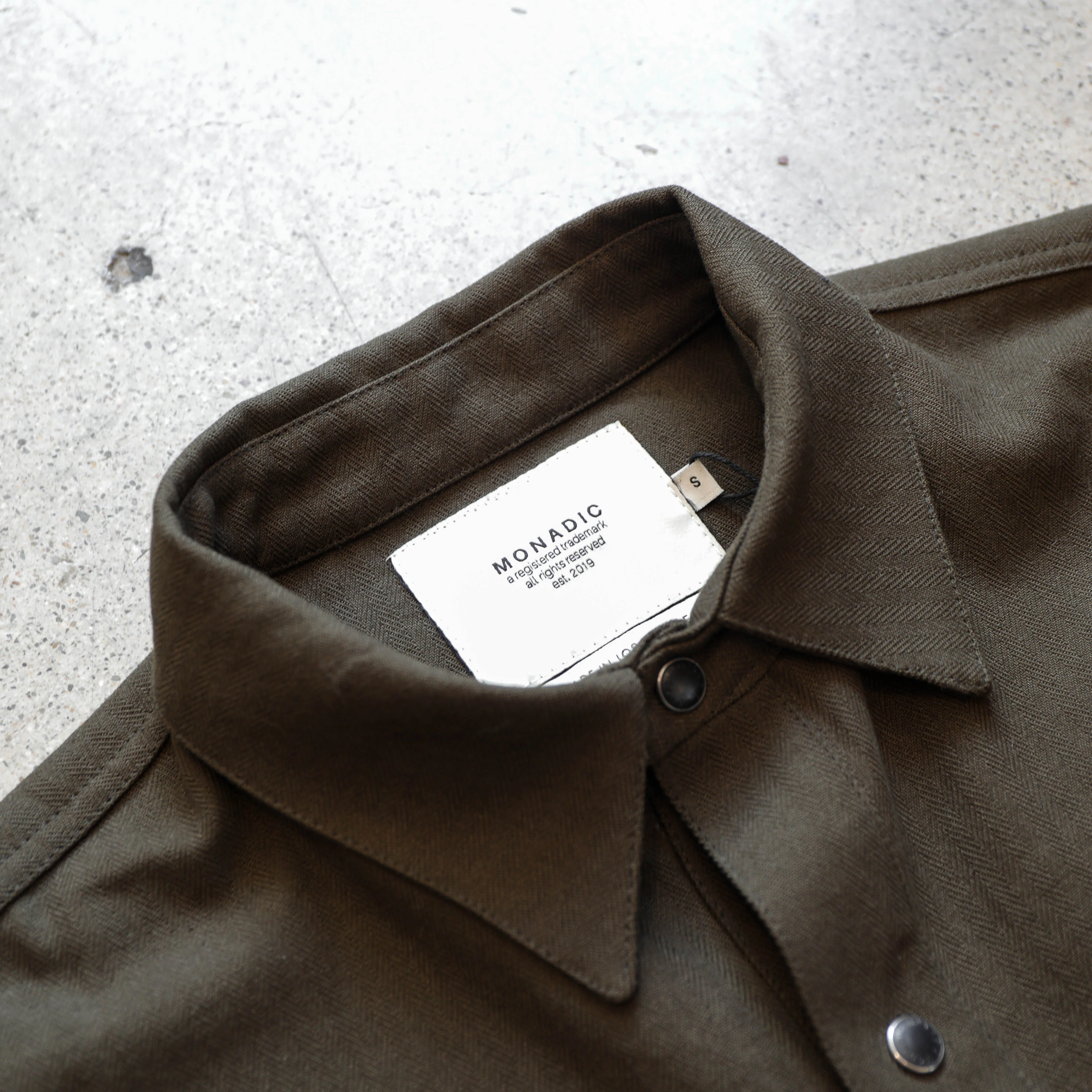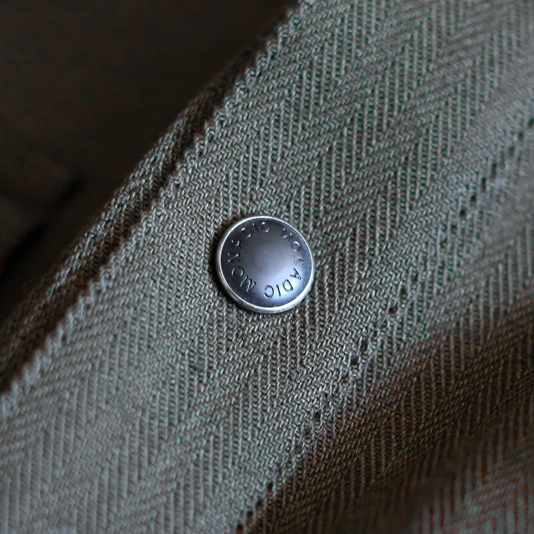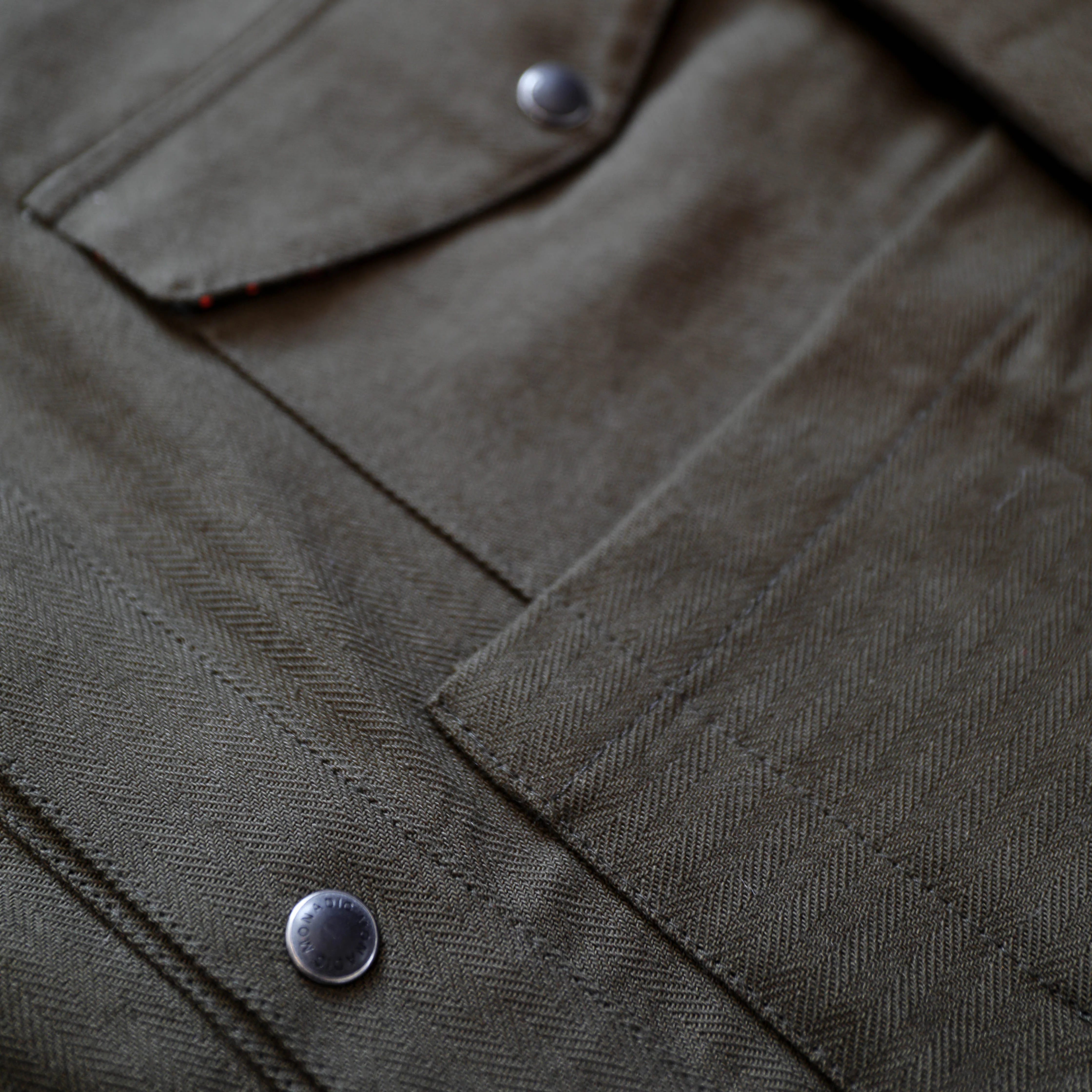 This makeup is made from an extremely rich Oive Herringbone cotton with Cosmic Camo contrasting fabric for the underflaps. Both fabrics from Japan. This garment has been enzyme washed and is soft to the touch even with the medium weighted fabric. Finished with Antique Gunmetal custom engraved snaps from Talon USA.