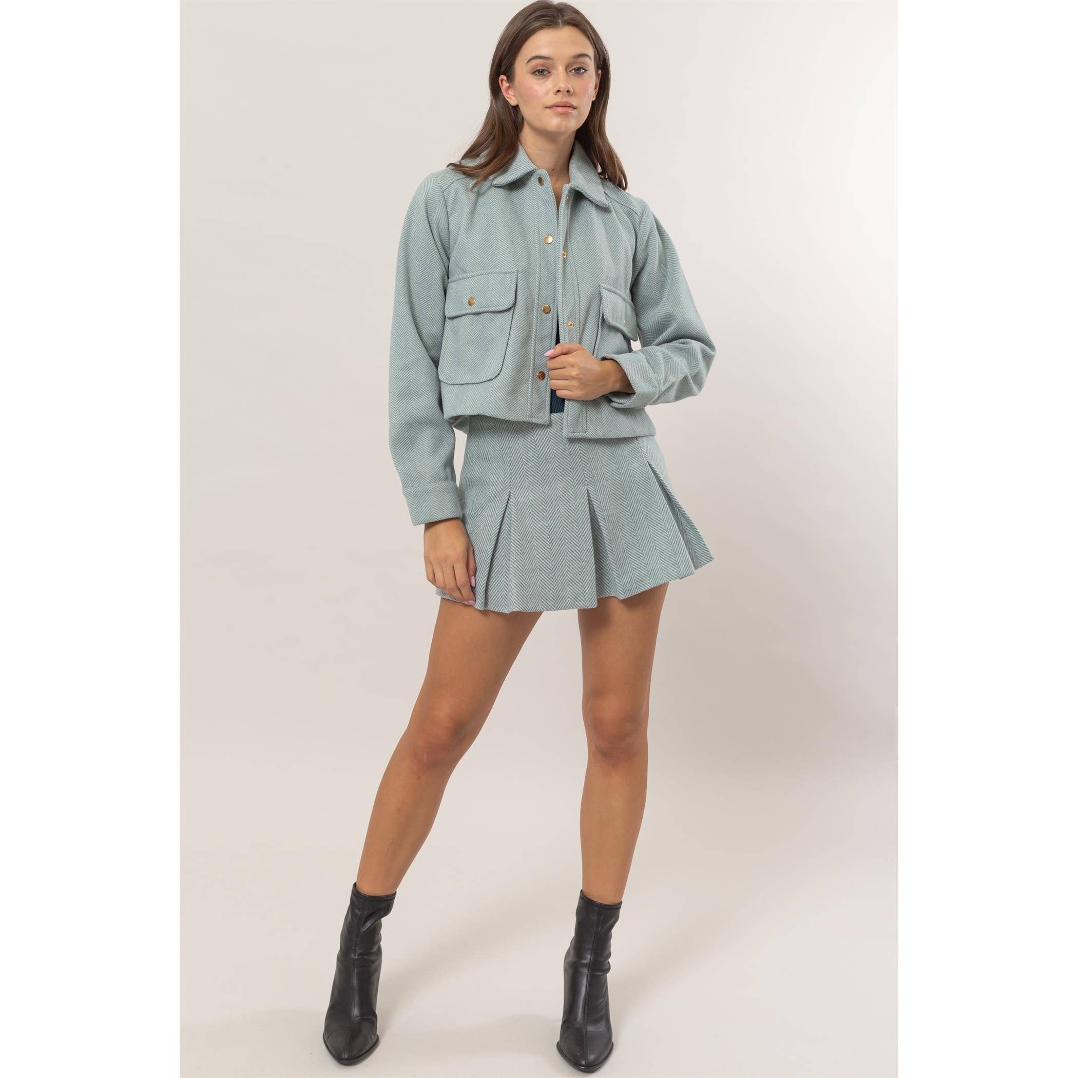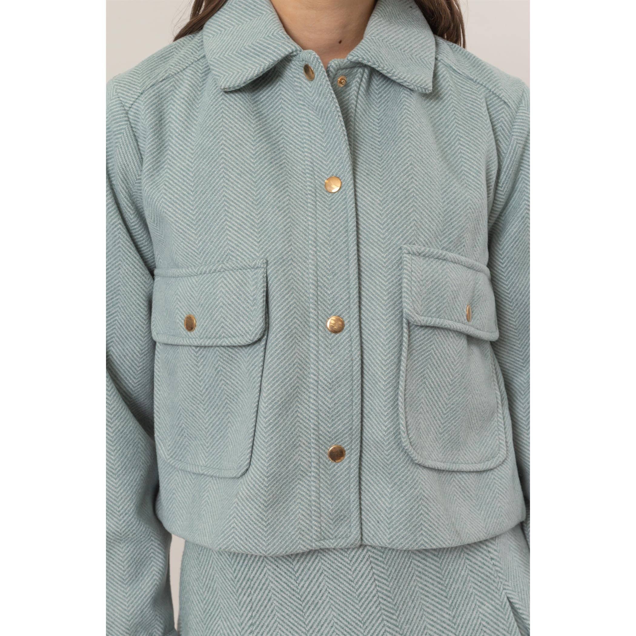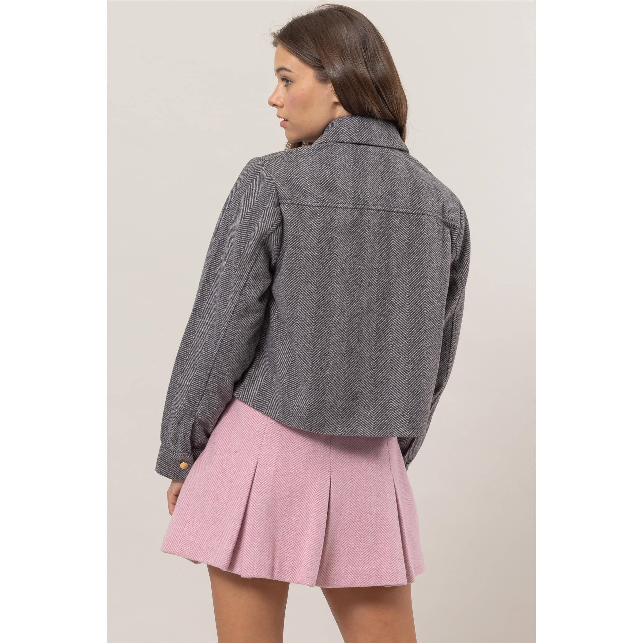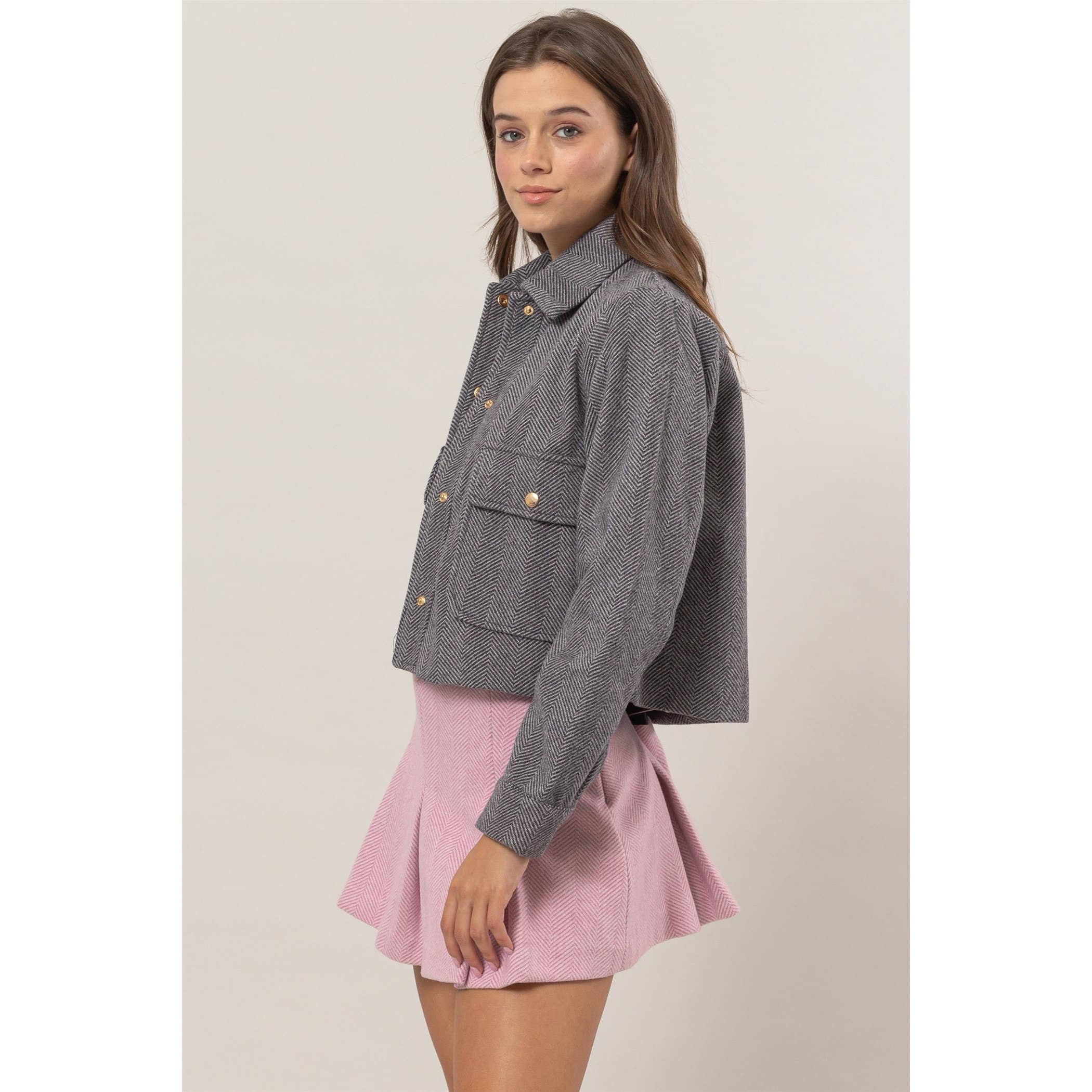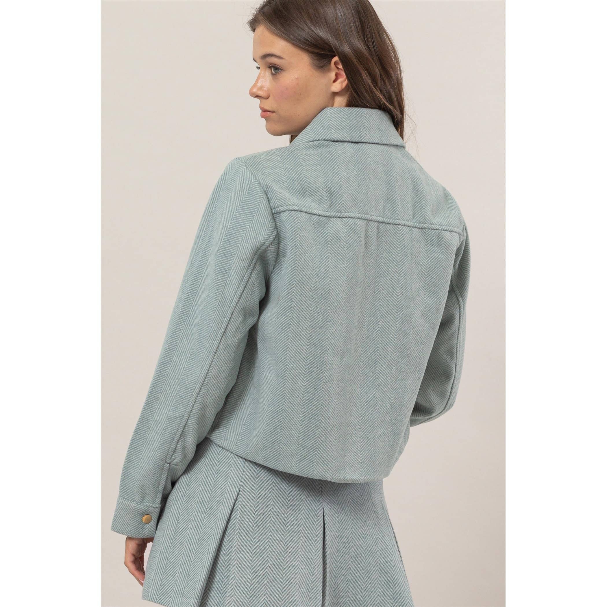 This Jacket Is Featured With A Point Collar, Long Sleeves With Buttoned Cuffs And A Cropped Length For A Flattering Look, While The Herringbone Pattern Is Sure To Boost Your Fashion Edge. The Button-Front Bodice Is Finished With Flap Pockets.