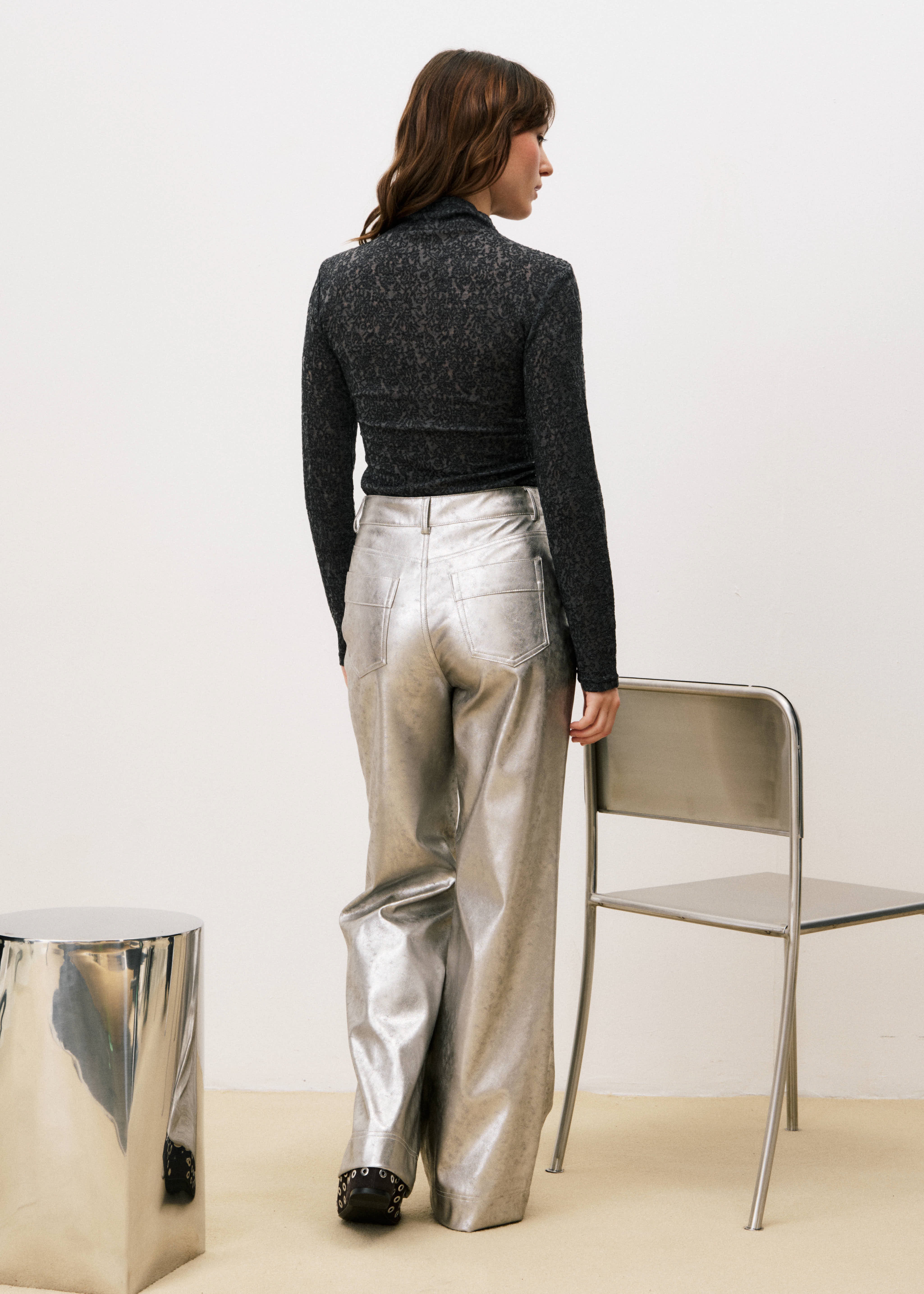 Slip into this charming anthracite top that's equal parts sass and sophistication. The semi-sheer stretch knit hugs your curves in all the right ways, while a subtle leopard pattern plays peek-a-boo across the fabric. A whisper of shimmer catches the light with every move, and that chic little turtleneck keeps things polished and put-together. It's the kind of piece that makes you feel effortlessly cool.