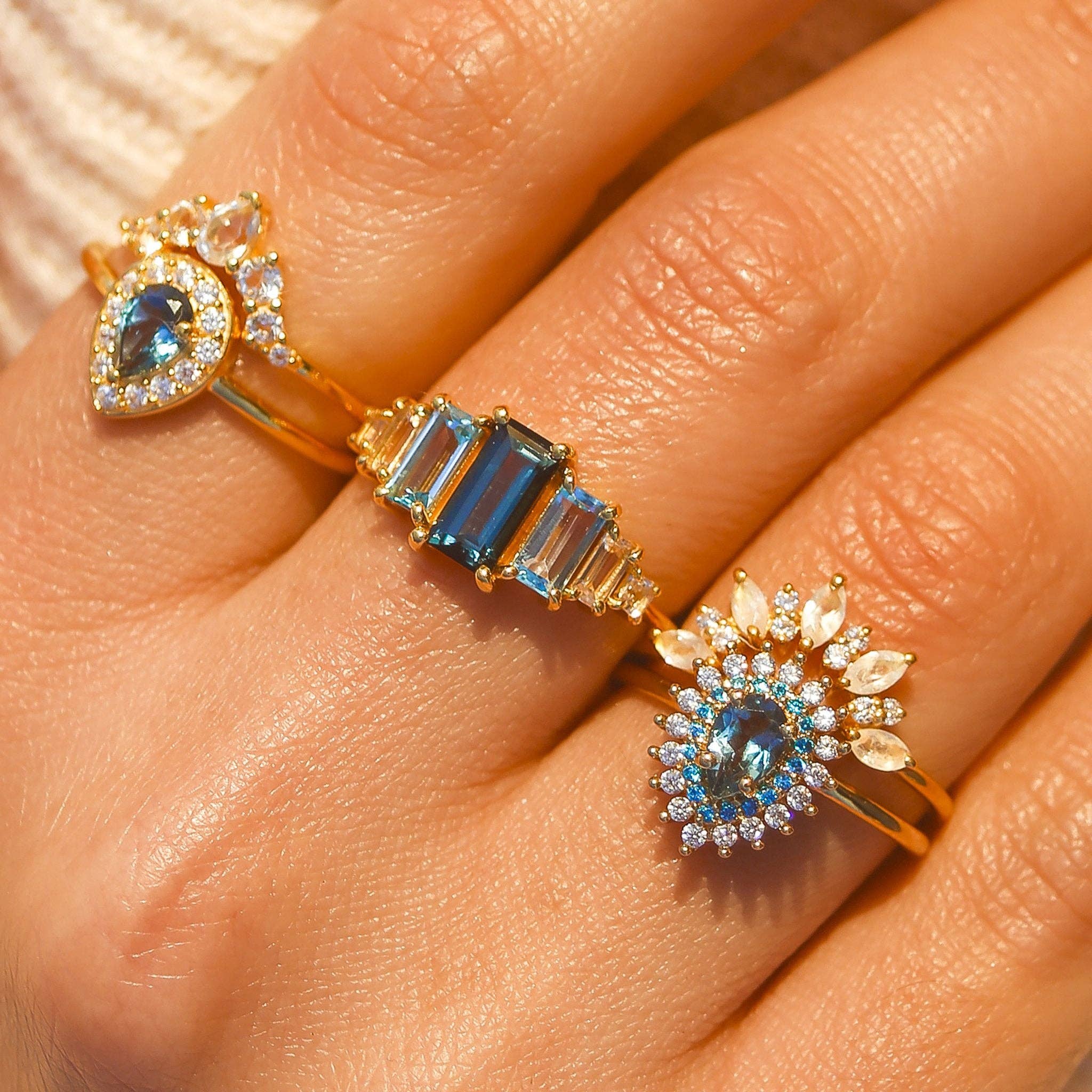 The perfect stacking ring is here... The Sunrise Arc ring is a La Kaiser staple, as it adds a stunning rainbow moonstone flash to your other rings.This ring looks amazing with either the Blue Topaz Vintage Versailles ring or the Opal and Diamond Sunflower Queen ring.