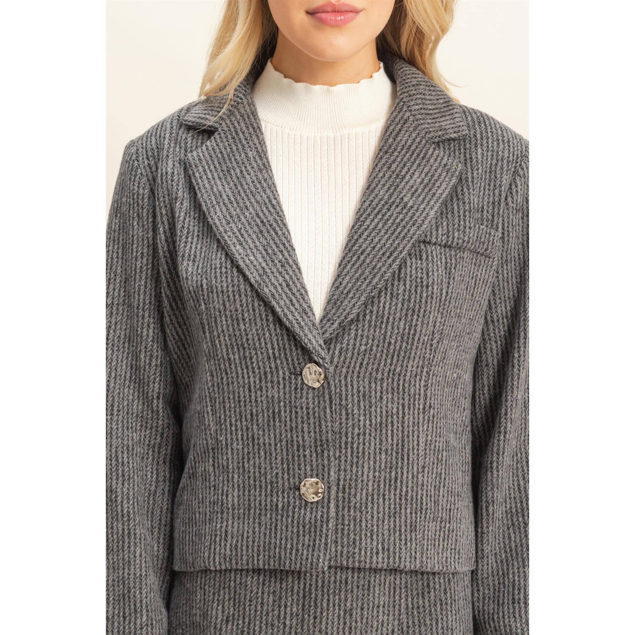 This tailored jacket features a structured fit and notched lapels, leading to double buttons closure that enhances its classic style. The textured fabric adds depth, while the front welt pocket introduces practicality and versatility.